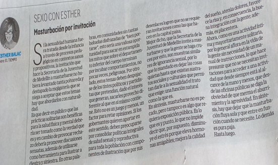 Dos noticias me quitaron el ritmo de marimonda que provocaba la música tradicional del Carnaval. Una informó sobre la campaña de la Alcaldía de Medellín que promueve la masturbación, en ambos géneros. La otra, la protagonizo el popular “JULITO”, el de la W, al opinar, en su propio micrófono global, sobre un Proyecto de Ley que una legisladora impulsa en el Congreso de la República sobre educación amorosa en escuelas y hogares de esta Colombia inmortal.