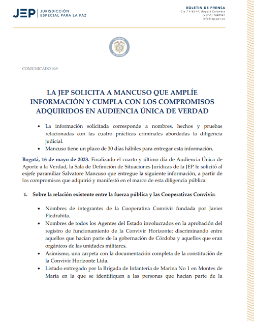 El que una persona como SALVATORE MANCUSO hable ante la JEP, es de suma importancia para este país llamado Colombia, que durante años ha visto como se derrama la sangre de millones de personas, se despojan de territorios a inocentes, así mismo, la vulneración a los derechos humanos ha sido una constante, y continuamos aún inmersos en una fratricida guerra que parece no acabar.